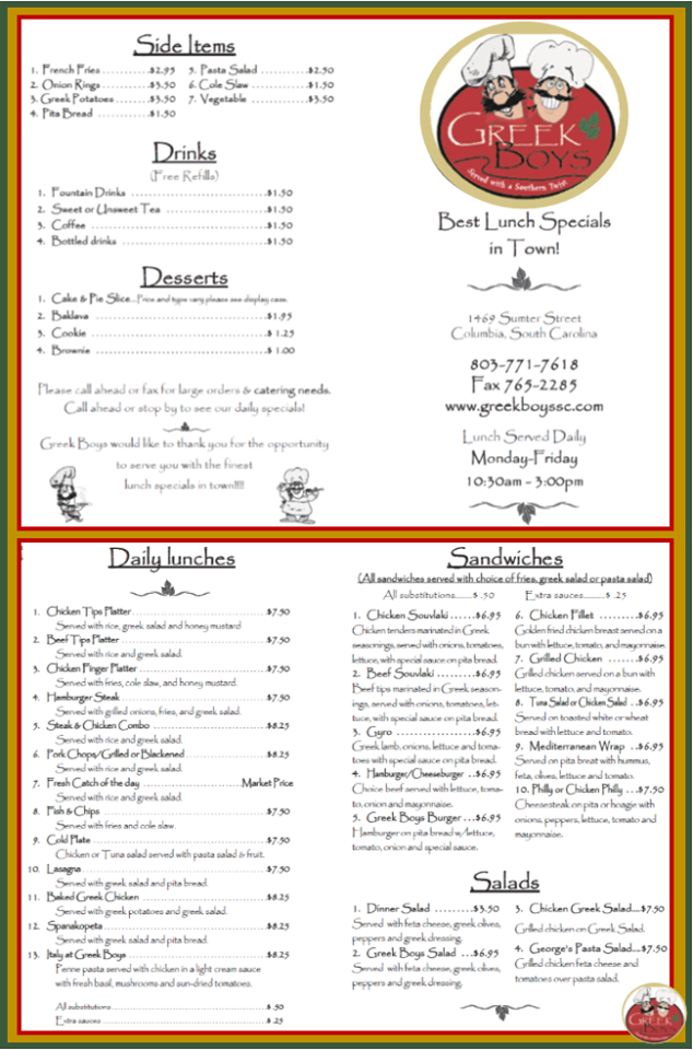 Welcome to Greek Boys, a delightful eatery in Columbia, SC, offering a vibrant taste of Greece right on Sumter Street. This gem serves a menu brimming with traditional flavors, perfect for lunch or a casual dinner. Signature dishes like the Greek meatballs glazed in a tangy garlicky sauce and served with a refreshing Greek salad bring authentic Mediterranean vibes to the table.